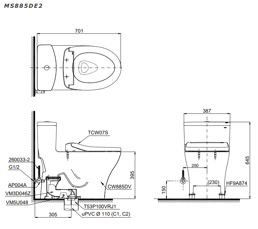 Bồn cầu 1 khối, kèm nắp rửa cơ ECO-WASHER TCW07S – MS885DE2