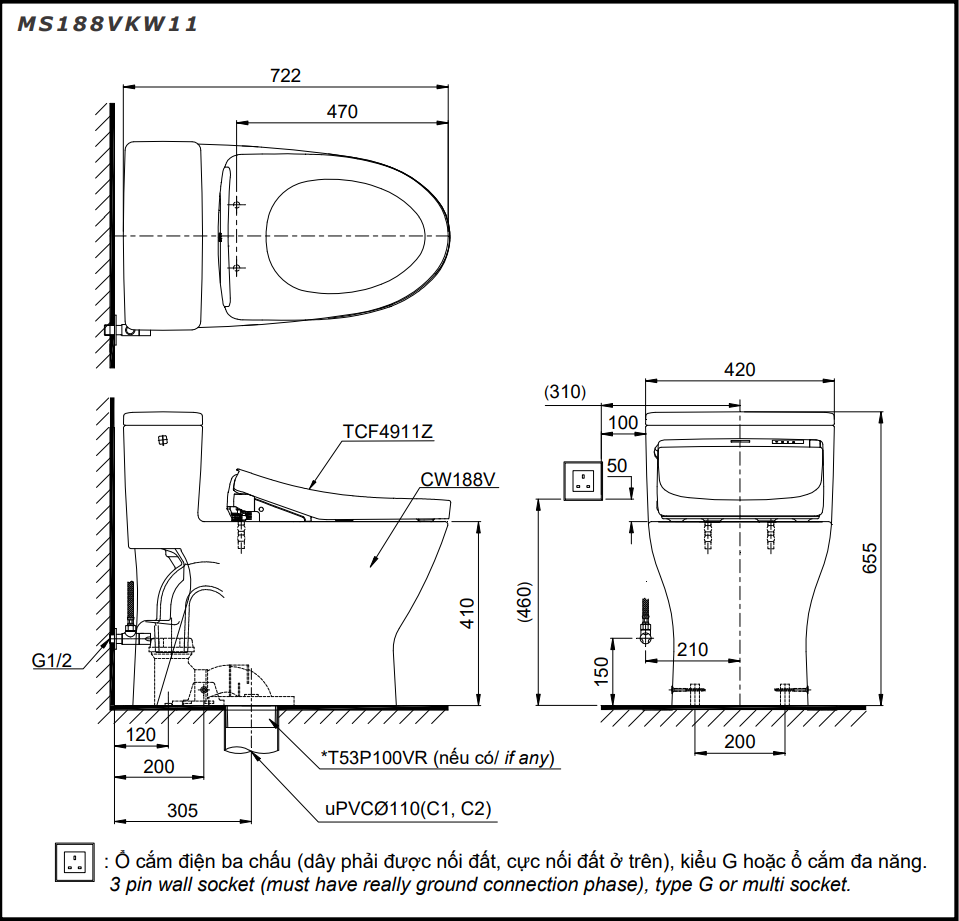Trang chủ > Thiết bị vệ sinh > Bồn cầu > Bồn cầu 1 khối, kết hợp nắp rửa điện tử NEW WASHLET dòng S7 - TOTO - MS188VKW11/T53P100VR