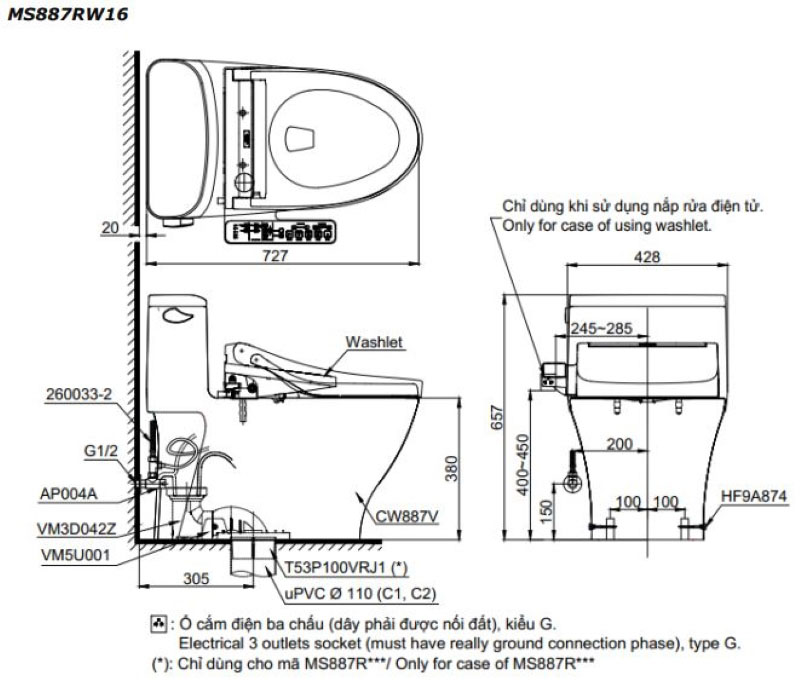 Trang chủ > Thiết bị vệ sinh > Bồn cầu > Bồn cầu 1 khối TOTO, kèm nắp rửa điện tử WASHLET dòng C2 - MS887RW16