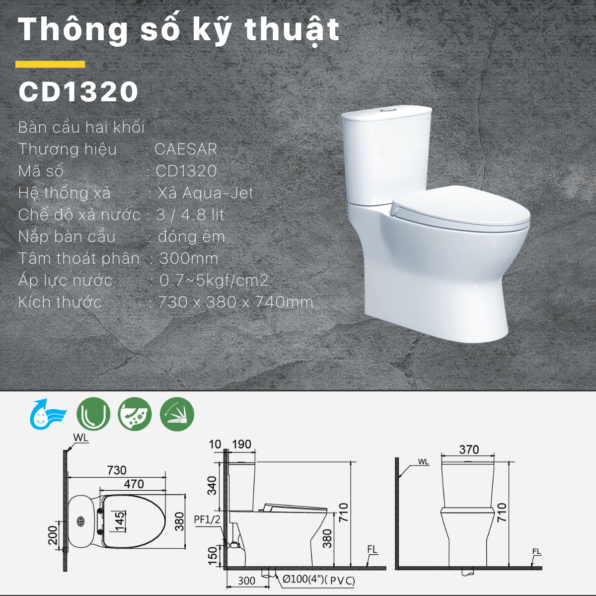 Trang chủ > Thiết bị vệ sinh > Bồn Cầu Hai Khối Nắp Êm - CD1320