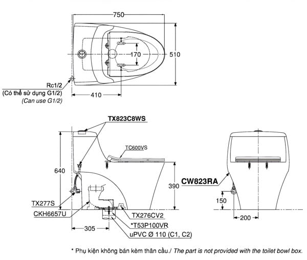 Bồn Cầu TOTO MS823DRT8 Một Khối Nắp TC600VS