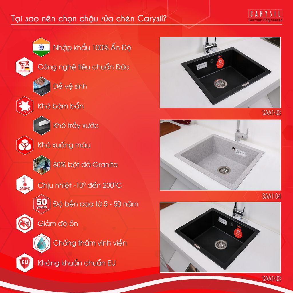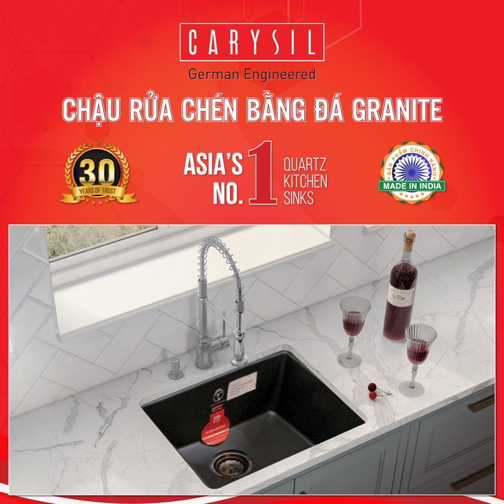 Xiphong chậu rửa chén Carysil được sản xuất theo tiêu chuẩn Châu Âu, sử dụng các