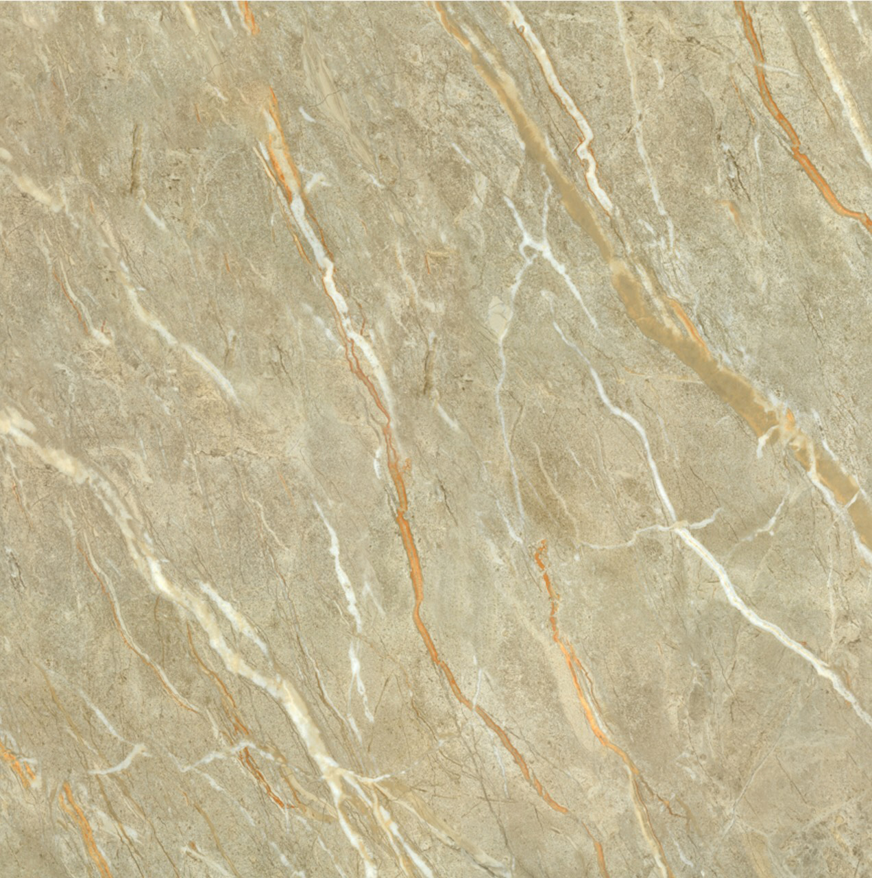 Sản phẩm gây ấn tượng bởi những đường vân đá cẩm thạch chuyển động tự nhiên với các sắc thái trắng, cam đất và nâu nhạt trên nền tông màu vàng rêu trung tính. Bề mặt gạch có độ bóng nhẹ, khi kết hợp với ánh sáng sẽ tạo hiệu ứng chiều sâu, mang lại cảm giác chân thực và phù hợp với các phong cách kiến trúc từ Hiện đại đến Tân cổ điển.